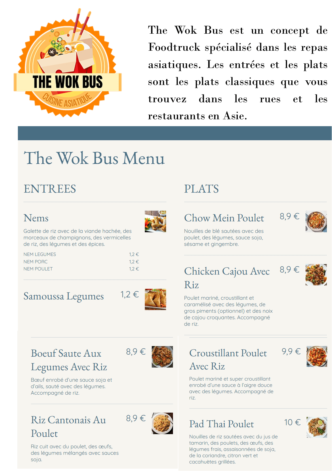 The Wok Bus est un concept de Foodtruck spécialisé dans les repas asiatiques. Les entrées et les plats sont les plats classiques que vous trouvez dans les rues et les restaurants en Asie.